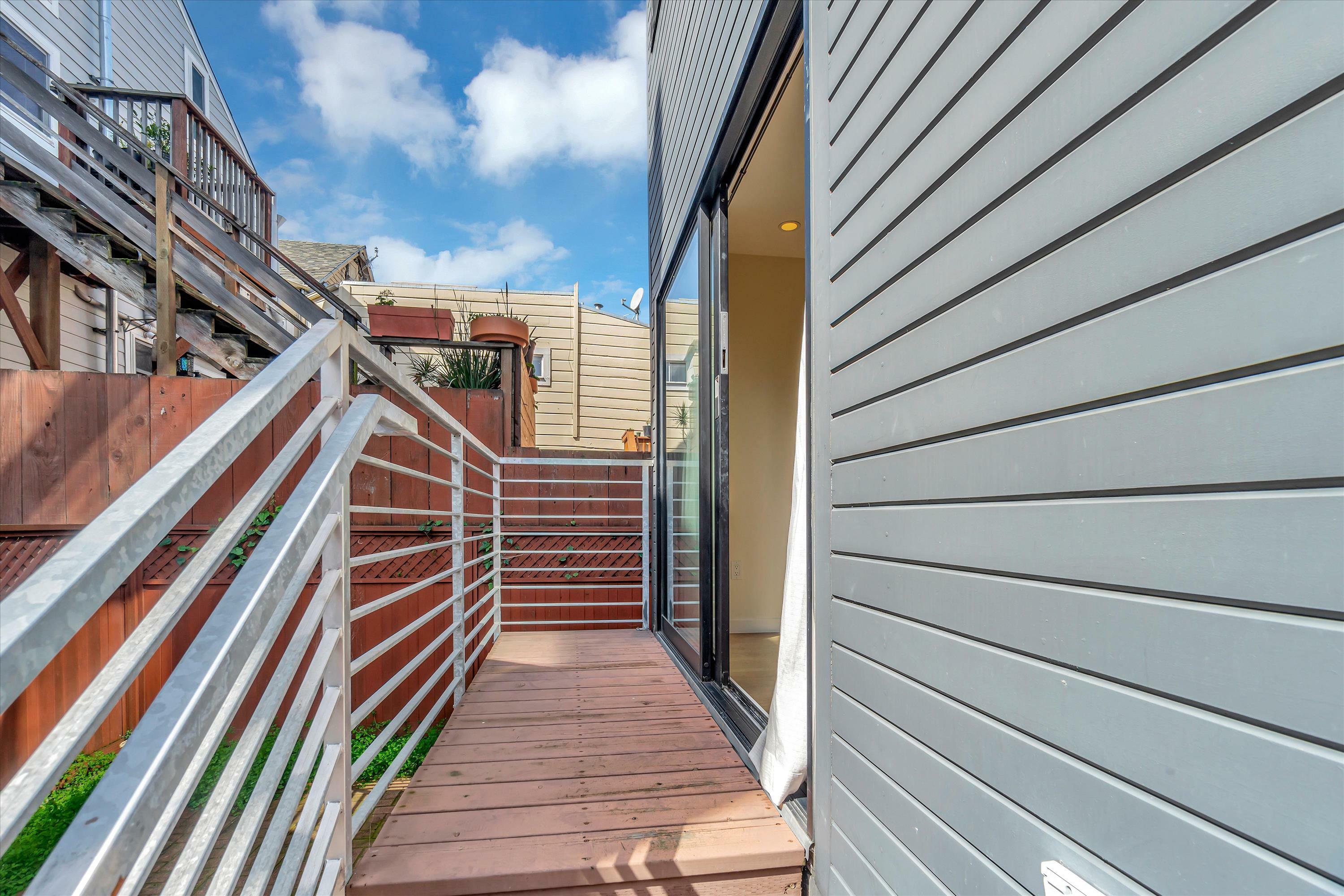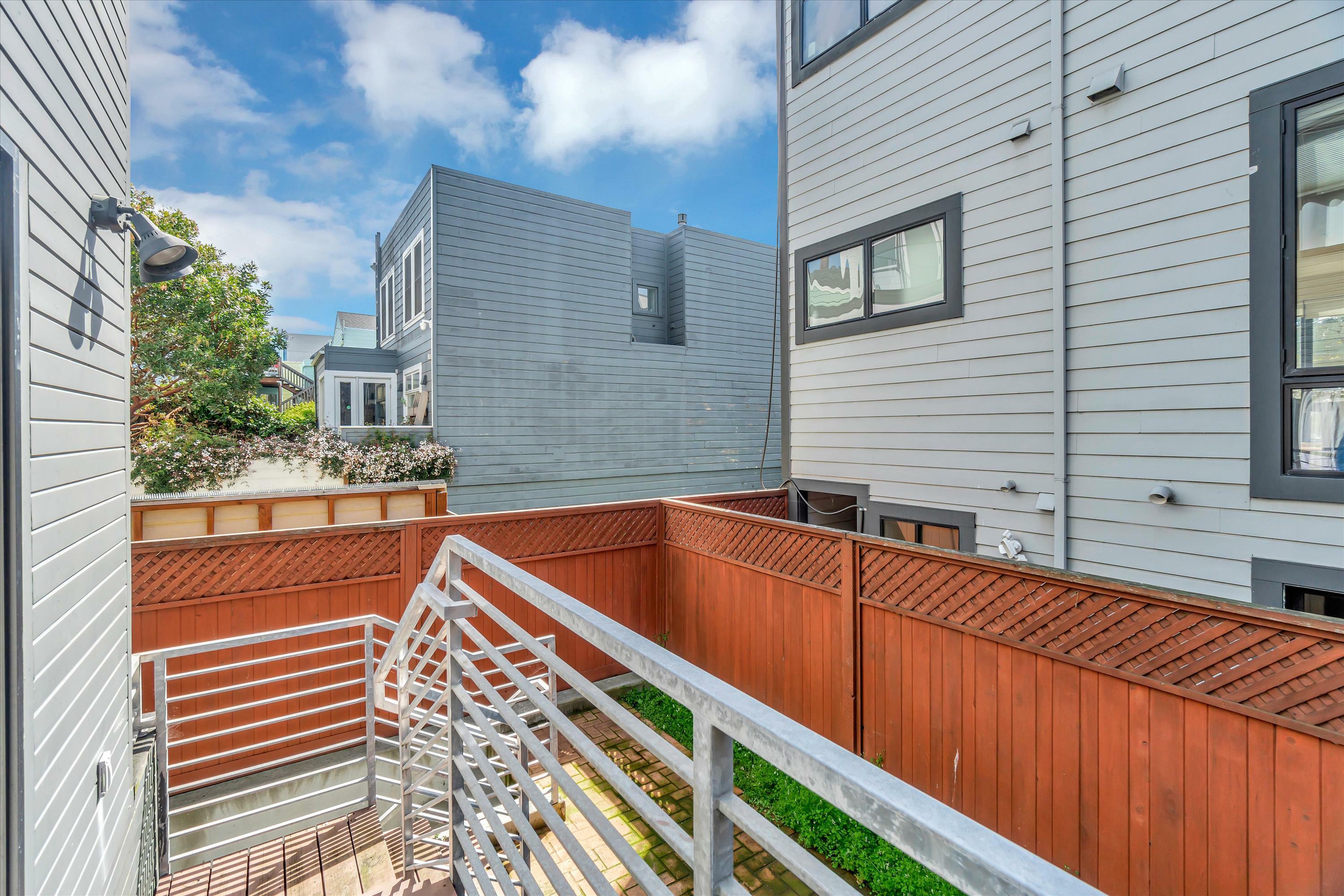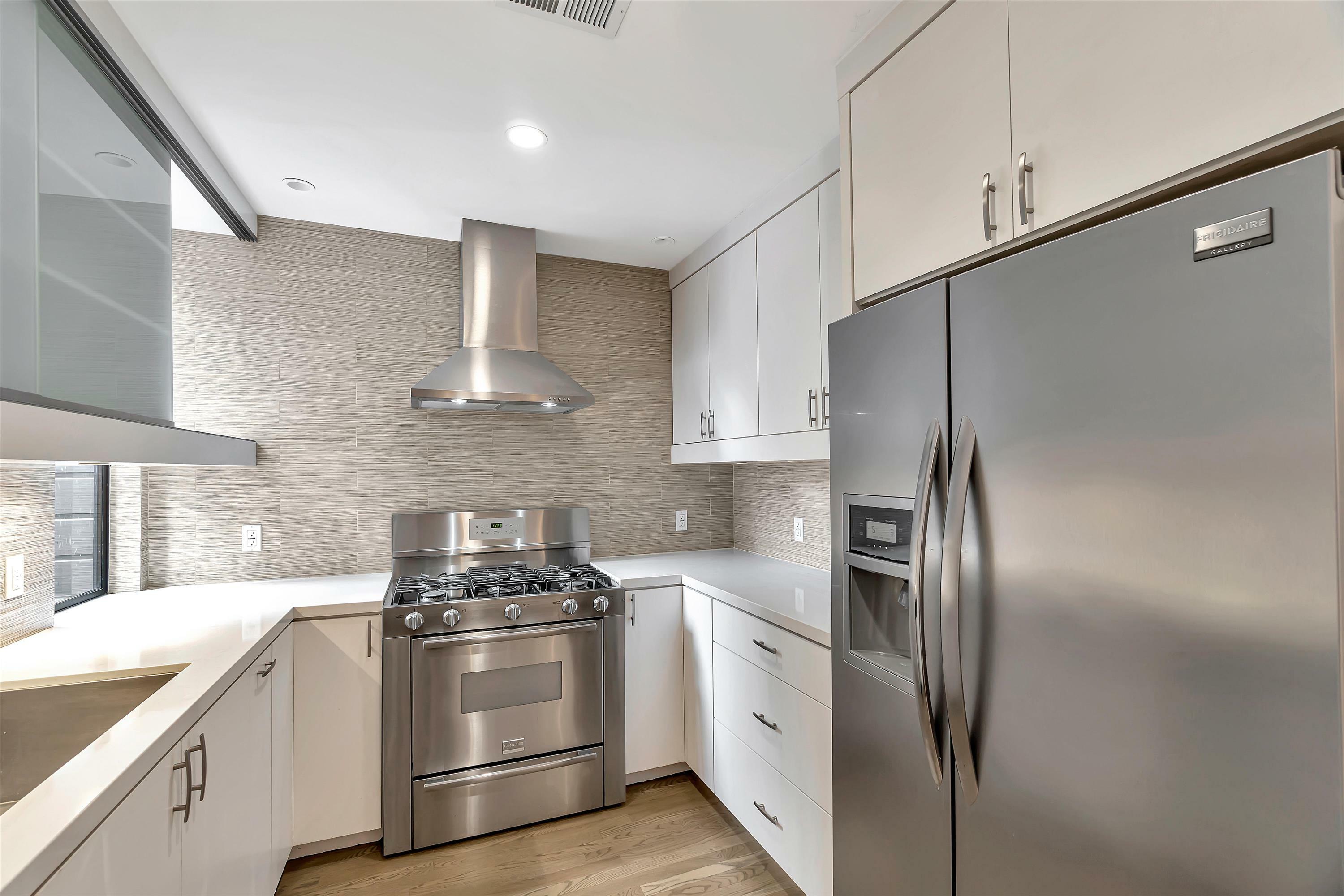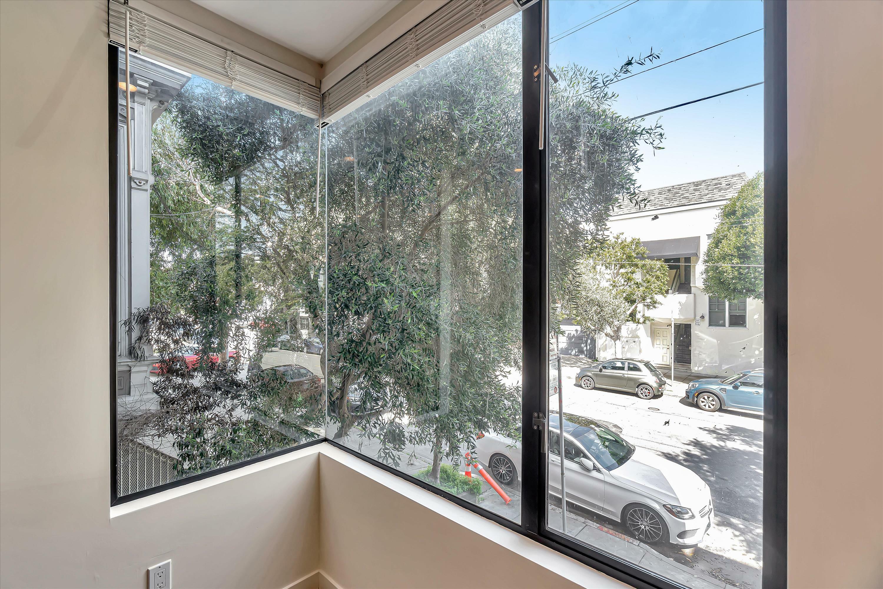 Located in the center of Hayes Valley, this contemporary home features a sleek open floor plan with hardwood floors and recessed lighting adorning every corner. The living room offers a cozy reading nook, complemented by an architecturally striking feature window, perfect for your relaxation and pleasure. This newer kitchen has quartz counters, under cabinet lighting, and stainless steel appliances including a 4-burner gas range, refrigerator and dishwasher. Step down to the bedroom level with two bedrooms and two full bathrooms. The primary bedroom faces the rear of the building which opens to a terrace and private rear yard. In-Unit Washer and Dryer. Shared view roof Deck. Walk-score of 99, walkers paradise.